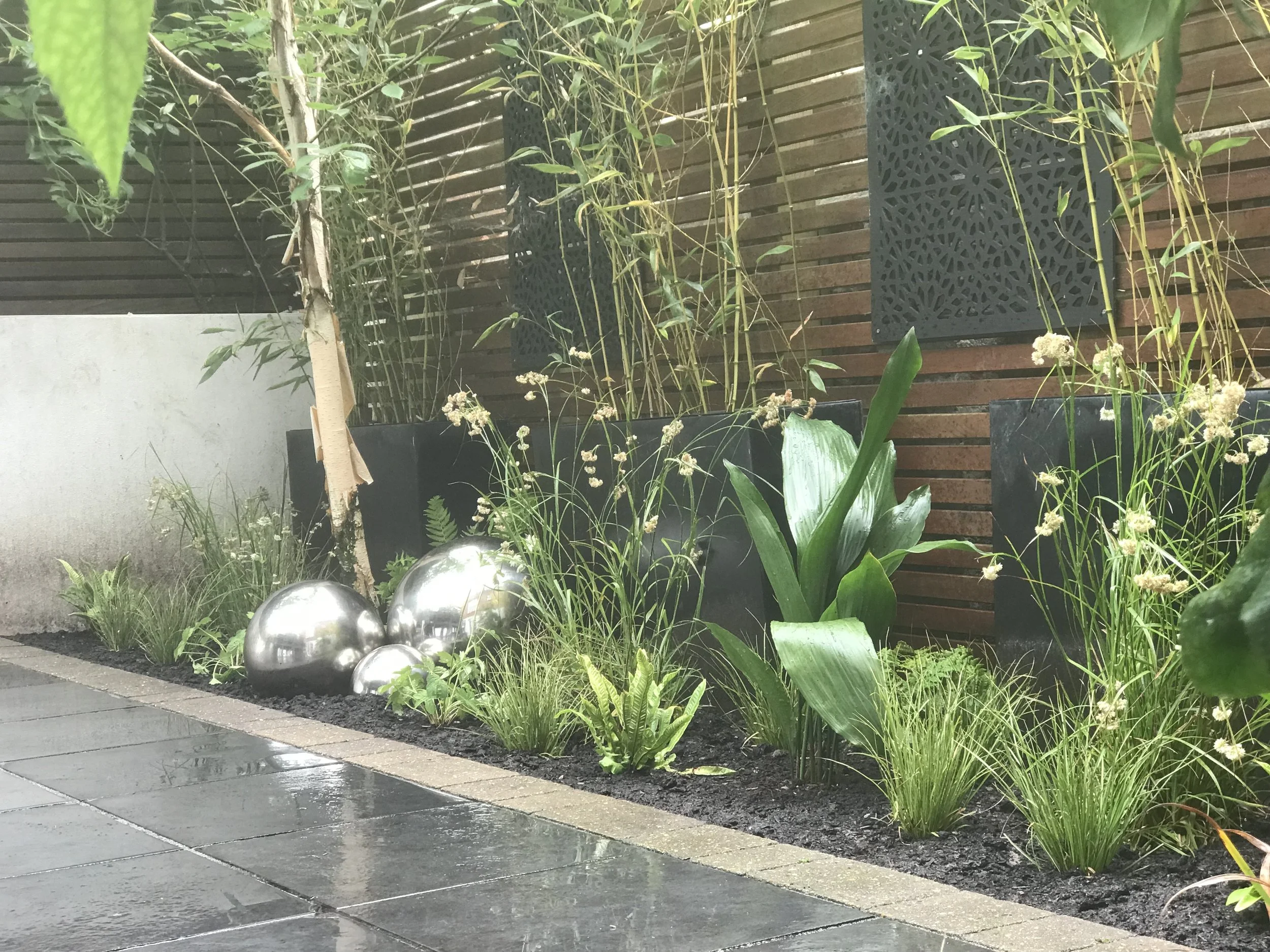 Supplementary planting was required here in this contemporary and rather minimalist space. Any flowers were to be white, with gentle contrast of texture. Ferns, native grasses and some forbes were used to attain this effect, including astrantias, luzula and the cast iron plant (Aspidistra elatior)